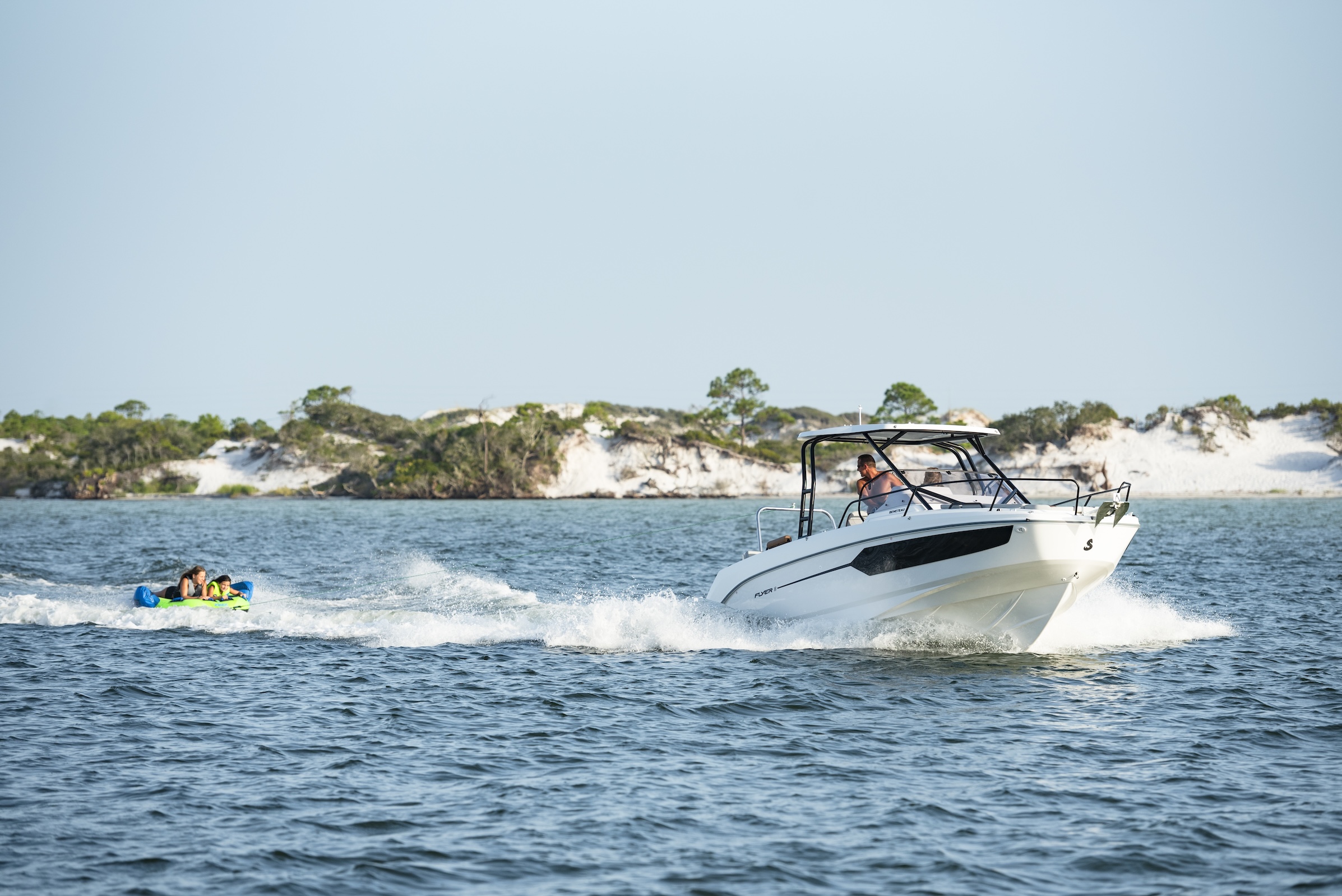 Das Flyer 8 Sundeck kombiniert sportliches Aussehen mit großzügigem Sonnendeck und verwandelt jeden Tag auf dem Wasser in einen entspannten Mini-Urlaub.